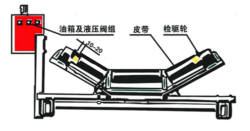 皮帶向一側跑偏后,皮帶即搭觸在糾偏機檢驅輪上,皮帶的摩擦力使檢驅輪轉動,帶動與之連為一體的專用低速油泵。油泵輸送液壓油至油箱內置邏輯閥組,經過邏輯閥組后流向液壓油缸,推動油缸動作。油缸推動調心托輥偏轉,偏轉后的調心托輥對皮帶產生橫向復位力(糾偏力)。皮帶復位后,檢驅輪與皮帶脫離接觸,停止轉動。